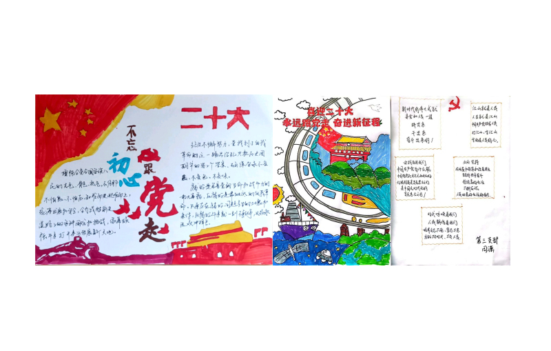 在支部全体党员认真收看二十大盛况后,支部首先开展了“我学二十大手抄报线上展示分享”主题党日活动,以图文并茂的形式,熟悉原文、把握重点、加深理解。部分党员与身边孩子一起共同完成了学习二十大手抄报,在精心设计制作过程中,以浅显易懂的语言向孩子们分享学习心得体会,使报告金句跃然纸上。